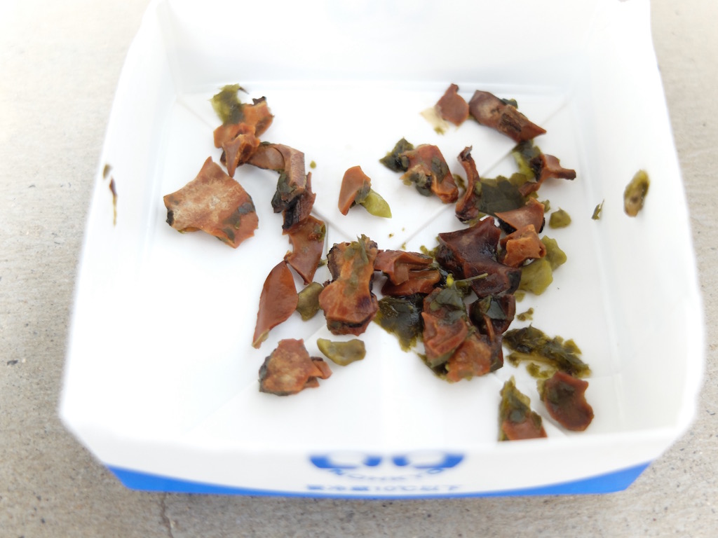 さて、早速このフンを洗浄してみますと「大量の植物繊維とともに茶色の骨片」が見つかりました。一見するとオニグルミの外殻に見えなくも無いですが、よく観察すると「ほ乳類の骨片」のようです。部位としては骨盤や肩甲骨のようにも思えますが、即断は出来ません(現在スタッフで検証中です)。また一緒に見つかった植物繊維ですが、葉柄が数多く含まれています。第一印象は「ヤマナラシ(ヤナギ科)」や「ウダイカンバ(カバノキ科)」のようにも見えますが、ほとんど原型を留めていないため、現段階では種名不明です。フンの中にあったのですが、微かに芳香がしますので(これまた微妙な表現ですね!)カツラ(桂)の木の可能性もあります。