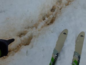 <右上:イノシシのラッセル跡と、当方のスキーのシュプール(時間差と警戒により安全確保済み)>