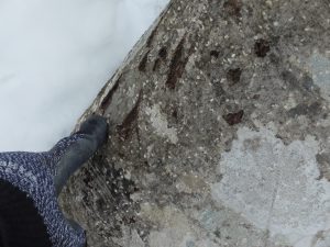 そして今回の積雪期調査では「豪雪環境下におけるニホンイノシシの採食行動」を示す貴重なフィールドサインを発見しました。このイノシシは「急斜面の雪崩により露出した地表部」にある植物の根や、地下茎を採食しているようです。またこの足跡が示す通り、新潟県魚沼地方の豪雪環境においては「ニホンイノシシは里山付近の杉林をシェルター(一時滞在場所)としている」ようです。